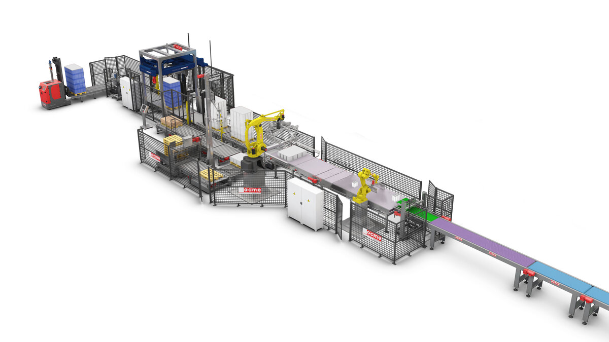 The customer's request was clear: to propose and design an automatic end-of-line system and logistic management of products on pallets, starting from a green field. OCME has been able to carry out this project by automating all the needs of the Italian Futura Line Group.